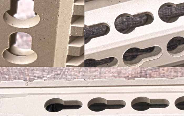 What's missing is a "tapering" inside of each keyhole. If you look at the drawing you can see that it isn't supposed to be a straight through hole. There is a 0.63 inches angled section of the hole where the "skirt" of the Keymod nut should fit, basically this is the negative print (if you look at it cross section) of a keymod nut and this supposed to be on the inside of the handguard. The bigger part of the keymod nut sits inside the accessory and not sticking out on the inside like with this rail. The "untapered" straight through hole runs 0.234 inches wide and 0.26 inches deep but on my rail this runs all the way straight through over three mm. The overall thickness of the rail wouldn't be a problem (the drawing only talks about minimum of 0.8 inches) as long as there is a place cut for the keymod nut to sit in but that is clearly not the case here.