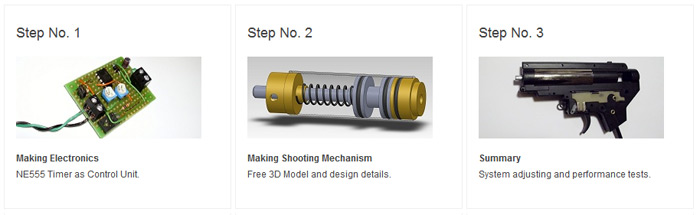 "There is many advantages. For me the most important is to eliminate motor’s sound. Also regulation RPS and FPS is very easy, and you don’t have to buy many upgrade – springs, pistons, motors, and batteries. All what you need to do is just adjusting one potentiometer to control ROF, and adjusting pressure to control velocity of BB."
