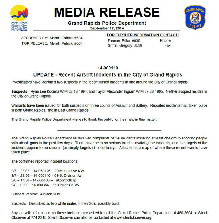 The airsoft hobby has just been given a big black eye by two men in Grand Rapids, Michigan. Last Wednesday evening, Ryan Lee Kooima, 20, and Taylor Alexander Ingram, 19, who are not residents of the Grand Rapids, turned themselves in after the Grand Rapids Police Department identified them as suspects and issued warrants for their arrests last September 9 according to Mlive.com.