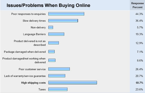 - High shipping costs is the no. 1 issue when buying online, followed by poor responses to customer enquiries and slow delivery times.