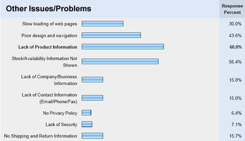- Lack of Product information and product availability (realtime) are also main issues when buying online, followed by slow loading of pages and poor web design. These indicate that online airsoft retailers should invest more in better designed e-commerce sites, take more time in providing adequate information about their products, and ensure that stock availability information is in real-time.