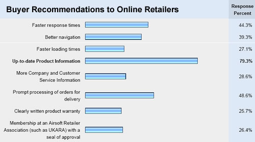 We have posted here our initial report on the survey to give airsofters and retailers an initial snapshot on their online buying experiences. It is significant to note that airsofters have indicated issues and problems that basically touching on the fundamentals of maintaining an e-commerce site, which for web developers and content providers know by heart. These are basically: