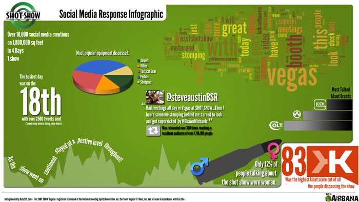 A very interesting tidbit of information about the even was gathered by Airbana, just like us, did online monitoring of the SHOT 2012, but unlike us, he was tracking Social Media of the things discussed at the event. You can read the blog entry at Airbana by clicking this: "Social Media Engagement during the 2012 #ShotShow" and an infographic shown below (you can click the full size the infographic at the Airbana Blog.