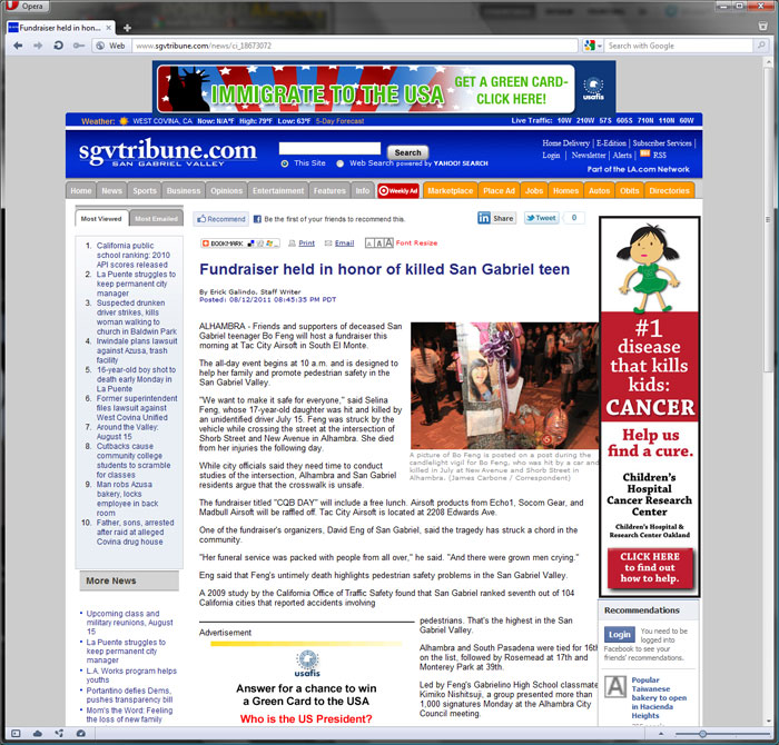 According to the San Gabriel Valley Tribune, friends, family and supporters of San Gabriel resident, Bo Feng, hosted a fundraiser at Tac City Airsoft last Friday, August 12, 2011. The fundraiser was done to help her family and help promote pedestrian safety in San Gabriel Valley. 17-year old Bo Feng was killed by an unidentified driver last July 15.