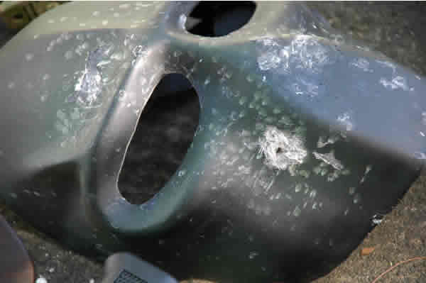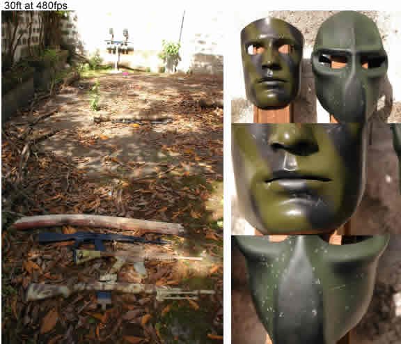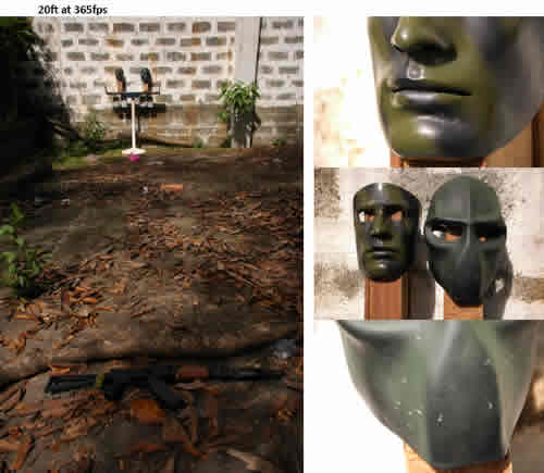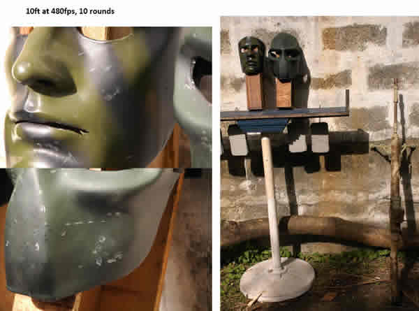 Target this time was the forehead as I wanted to make sure the lip area didn’t get beat up more than necessary. Finally, some paint was chipped away from the HFC22 mask, but the resin appeared to remain intact. Not so good for the Sykes mask (check the right brow). Yes, that’s the fibreglass, any section of the mask that weakens will break eventually should I persist in shooting that area. Well, it doesn’t take rocket science to figure it out.