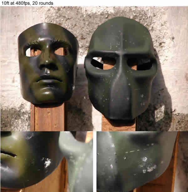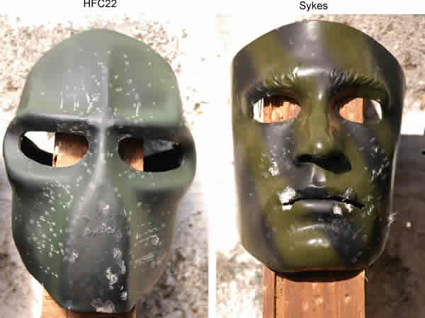 Target was the left cheek. I fired 10 rounds each at the same spot, at the same distance, and at the expense of sounding repetitive --- yes, there was no significant damage on the HFC22 mask other than paint chips. Again, the resin remained intact. Sykes mask on the other hand, showed signs of buckling on the resin.