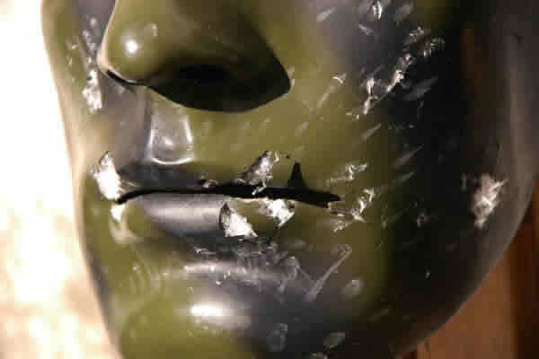 I am beginning to run out of space and had to use the lip area as the target. Once again, we saw paint chips from the HFC22 mask breaking away with the resin intact. Our Sykes mask this time has started to crack on the left side of the lip.