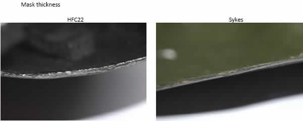 Major difference between both masks, overall, the HFC22 is thicker, even more on key areas. Here’s a comparative of the thickness between the two masks.