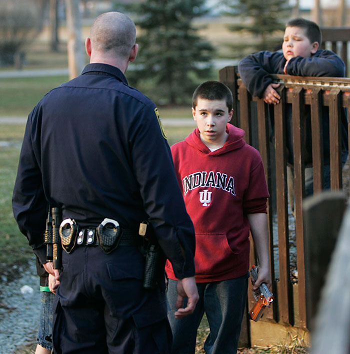 (Photo above: Police meeting kids at Baker Park after parents reported them to 911 for playing with airsoft guns as writte nby Max Gersh on his Gersh Photo Post Blog "A Weekend of Guns")