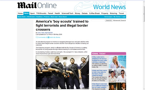 Is this going a little bit too far? You've got the American Boy Scouts being offered Counter-Terrorist training program or even anti-illegal immigration border patrol. Called the "Explorer's Program" the members of the Boys Scouts of America being put through such a training. At such a young age, do you think that this is just too early for them to earn the ropes? Personally, I am kinda uncomfortable with this types of programs remembering the Nazi Youth paramilitary approach. See in the photo in the story that they use airsoft guns in this type of training. I still prefer camping, first aid, sharing jokes at a camp fire, leadership skills and just meeting new friends. I would like this program just restricted to adults rather than the Boy Scouts.