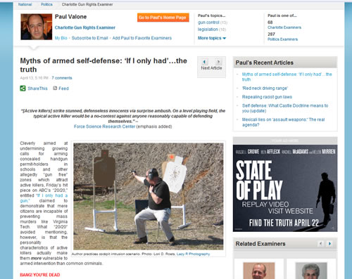 Interesting article at the Examiner.com, Paul Valone gives a critique of the ABC's 20/20 "If I Only Had a Gun" claiming that this show was "rigged" to tone down calls for people to be allowed concealed firearms, especially with the growing gun violence happening in the USA in the past weeks and months. Paul Valone is a 2nd Amendment supporter ("Right to Bear Arms" in the US Constitution) and advices on gun rights supporters through GRNC. The show is purportedly said to discourage gun ownership for untrained civilians and leave the armed defense to trained people such as those from law enforcement agencies (SWAT, HRT, etc.).