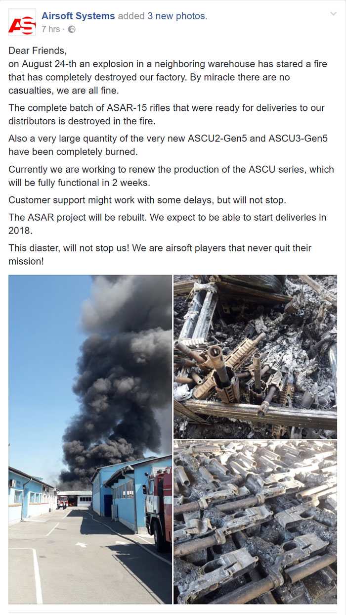 According to the company, an explosion at a nearby warehouse caused a fire that destroyed their factory. It destroyed a complete batch of ASAR-15 AEGs that were ready to be shipped as well as their latest generation ASCU units which are like MOSFETs that are in use in many AEGs this year.