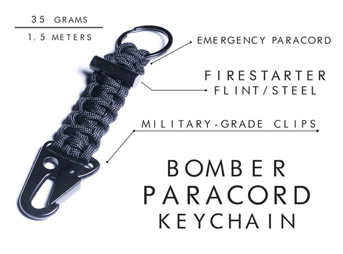 Both the Bomber Paracord Bracelet and Keychain were designed to accompany the Bomber Barrel Duffel Bag whether you are in an urban area, or in the outdoors. The worse case is that a sudden national or worldwide catastrophe happens and you have to bug out without being able to get home to get the essentials for you to survive.