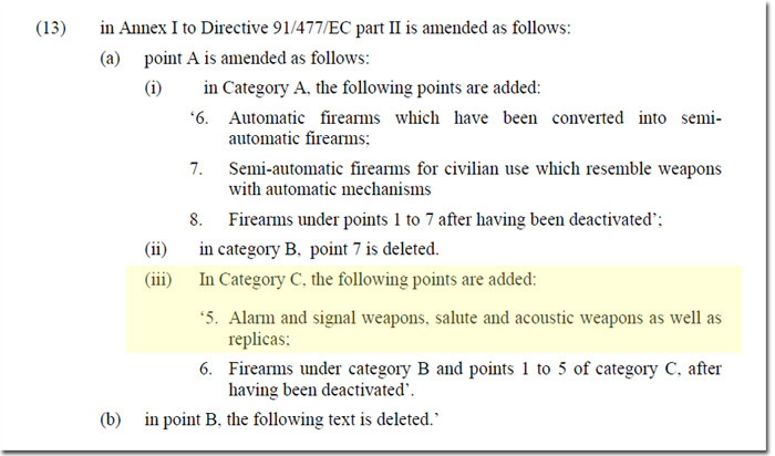The European Commission wants to amend the EU firearms directive so as to classify any replica with the form of a firearm as a Category C weapon, this would mean they would at a minimum fall into the same category as most hunting rifles and shotguns in your respective home countries.