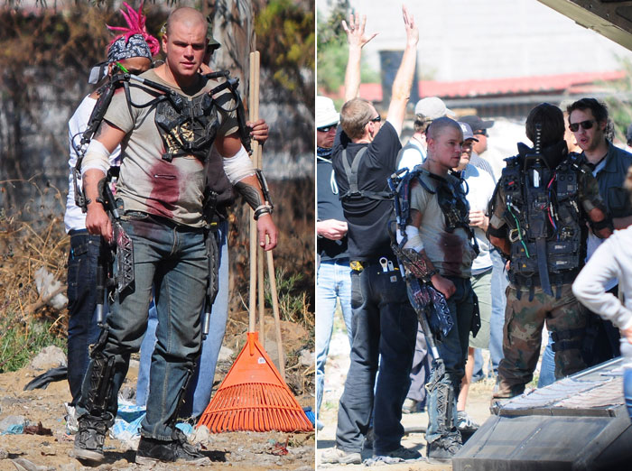 Now, on to the gear. Matt Damon seemed to be wearing a lightweight exoskeleton system that may provide more strength to carry loads and move over longer distances. No armour system can be seen on him, but given the existence of an assault rifle-type rail gun, armour may just be useless. One of the actors in the photo also is wearing an exoskeleton that seemed to be a contraption of ventilation fans, power supplies, and samurai sword.