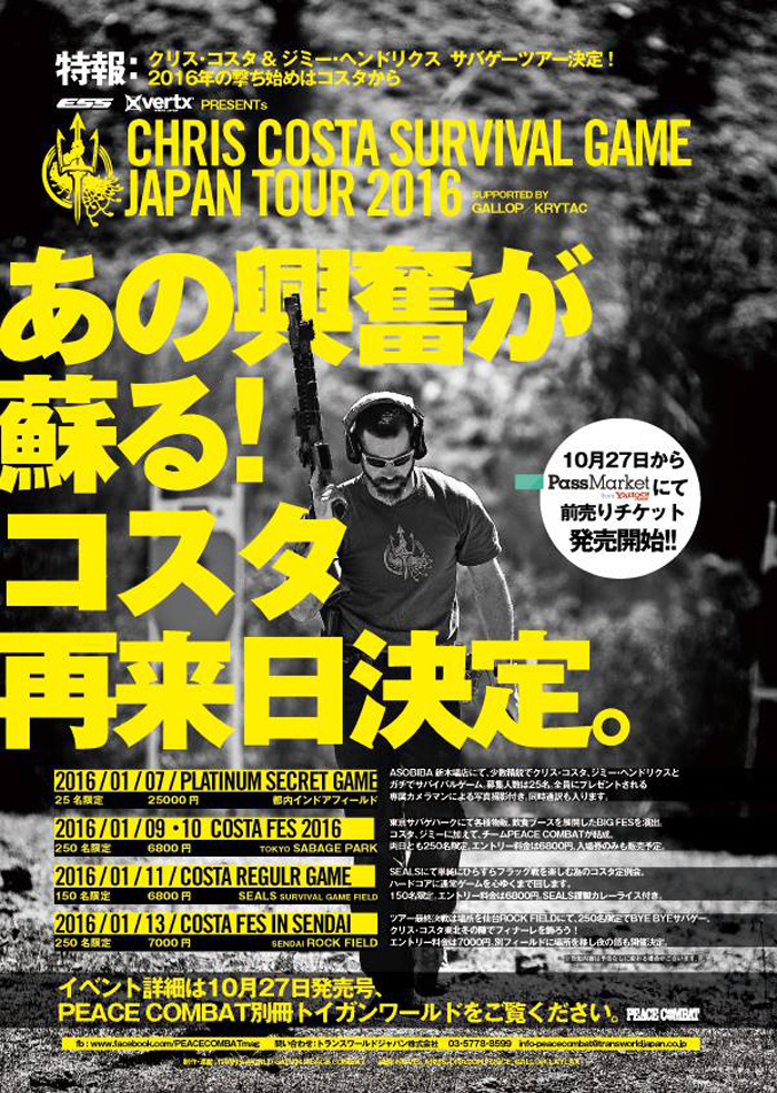 #Costagate2015 or not, the Japanese airsoft and community wants Chris Costa back, and they want him badly. With that said, Chris Costa will oblige and thus, Chris Costa Survival Game Japan Tour 2016 is all set to take place in January. Just like the 2015 event, Peace Combat Magazine will be hosting the event again.