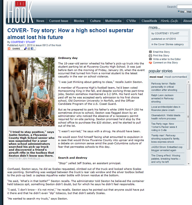 ...until he drove to school his father's F-250 truck that did not have a parking permit at his school. The school's assistant principal wanted to search the vehicle, and after consulting his father who told him to allow the search to avoid further suspension, was found with a broken and unloaded AR-15 airsoft rifle among the tools on the flatbed portion of the truck.