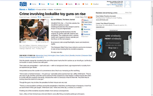 I came across this news on airsoft at Technorati, a report from USA Today in Delaware that there are crimes committed involving airsoft toys are on the rise with already two fatalities this year. Two men were shot when they pointed the replicas at State troopers. Though these are not surprising as criminal elements will resort to anything to commit a crime, and airsoft is just one tool. Nevertheless, these incidents bring about negative image for airsoft, something must be done about this before proposals to totally ban airsoft as a measure is played on the minds of local residents.