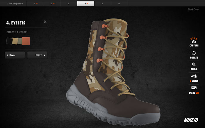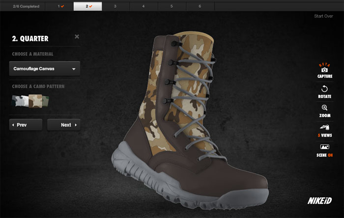 Step 2: The Quarter. There are more materials available here: Synthetic Suede, Full-Grain Leather, Canvas, or Camouflage Canvas. I chose Camouflage Canvas, and then was given a choice of colour patterns: Black Camo, Grey Camo, Desert Tan Camo, or Classic Olive Gramo. In this case is selected Desert Tan Camo.