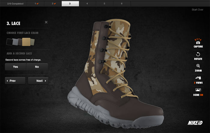 Step 3: The Lace. This a simpler step as you will just need to select a lace colour: Black, Cool Grey, Coyote Brown, Desert Tan, or Classic Olive. To make it consistent with the desert tan idea I have in mind, I selected Desert Tan as lace. You can add a second lace free of charge, which I suggest you do.