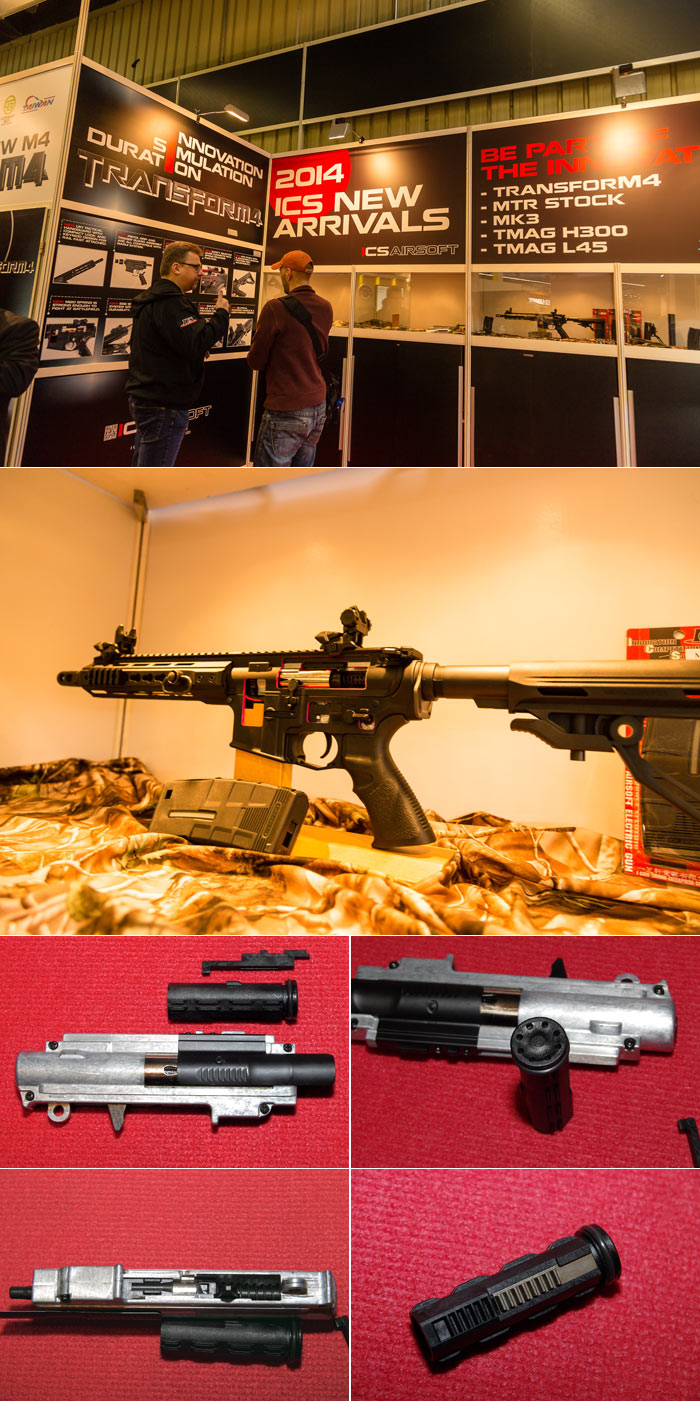 We had an appointment with ICS at 1030H, so we needed to rush to the end of Hall 7 to find their booth. We are very much interested in the new ICS Transform4. The images show what approach ICS took to create felt recoil with an AEG. The bolt imitation on the side of the gearbox is not attached to the piston so it is easier to disassemble the gearbox plus less things can go wrong. The movement of the bolt imitation is done through that small hump on the top of the piston. We can expect the usual ICS quality here and I'm told the internals can handle a 150 spring out of the box.