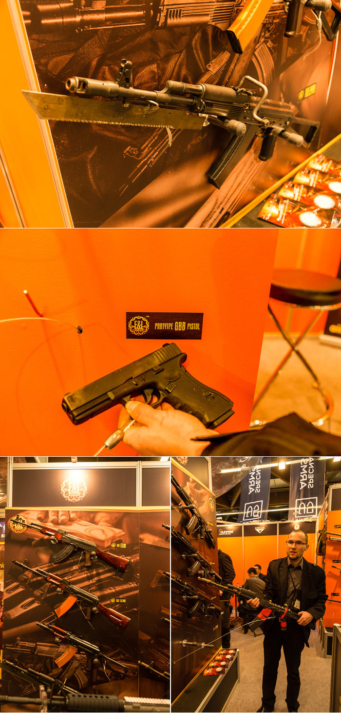 Gunfire has a strong presence at the IWA 2014. The main stars at their boot are the E&L Airsoft AKs and their Glock-like and M4 Gas Blowback Prototypes. On display was the E&L AK AEG that was tortured by SCDTV in the epic torture test video on YouTube. Gunfire also has custom series such as Kryptek Series of AUG AEGs.