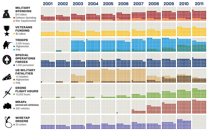 While the world observes the anniversary, Americans still have much to reflect on the attacks. They have sent young men and women to go after a small organization that relies on terror to spread its extreme Islamic agenda. However, along the way the priorities went wrong, with an invasion of a country that wasn't connected at all to Bin Laden nor was it planning to build weapons of mass destruction to attack the US. Hundreds of thousands of lives lost, and trillions of dollars (6.6 of it and counting) have been spent, but the War on Terror is still far from being concluded. This infographic at Wired.com will give you an understanding of how US resources were used. Click on it to go to the page.