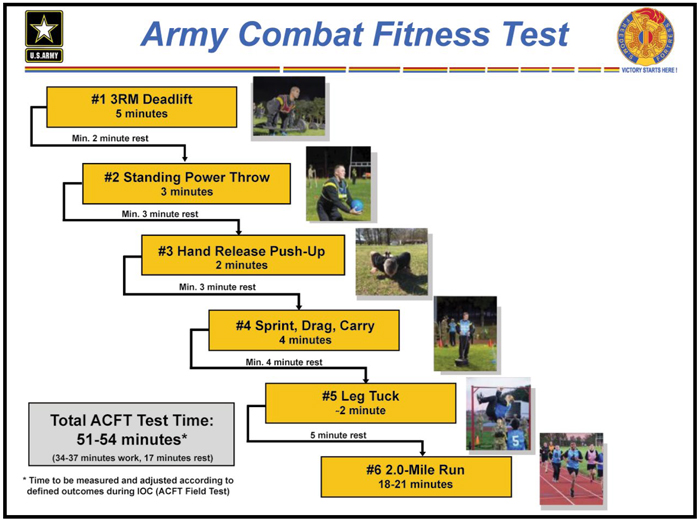 2-mile run: Same event as on the current test. In the ACFT, run scores are expected to be a bit slower due to all of the other strenuous activity.