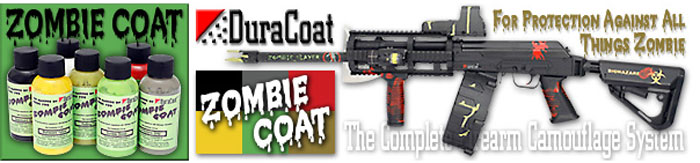 I thought I've seen them all: a zombie killer gun, zombie ammo, zombie blaster, zombie targets, a gun mounted chainsaw for zombie killing, a zombie holosight made by EOTech... and now a Zombie Coat for getting that gun ready for that post-apocalyptic look as reported by the Firearms Blog. You can get the Zombie Coat Pack to paint your gun at Lauer Weaponry in all the gory names you can think of the color swatches: Graveyard Black, Tombstone Gray, Blood Red Green, Biohazard Yellow, Zombie Green, and Rotting Flesh.