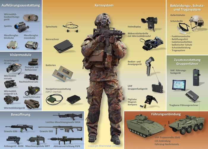 According to the Bundeswehr, the The IdZ-ES empowers infantry, armored infantry and even the infantry forces of the German Air Force and Navy to be able to perform their mission with significantly improved chances of success and reduced risk. In order to achieve these the required capabilities, the IdZ-ES is a modular system that have components that can be fully match and optimized to meet mission objectives and has the following subsystems: