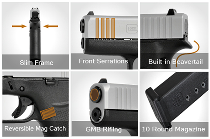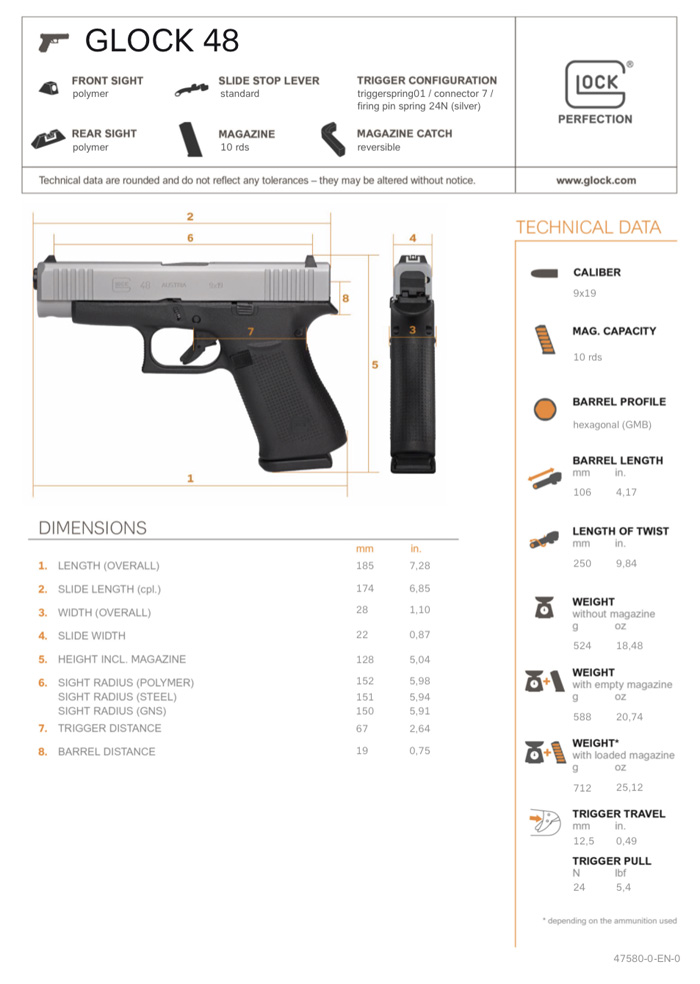 The G43X and G48 also feature the silver nPVD finish on the slide. According to Glock this finish is a variation of what is seen on the G19X and the latter went through intensive military testing during he Modula Handgun System (MHS) program. Both pistols have a similar height as the G19 and their slimline width is for increased concealability. They feature front serrations, built-in beavertail, reversible magazine catch and a match-grade GLOCK Marksman Barrel. They come with 10-round capacity magazines that have high-visibility orange followers.