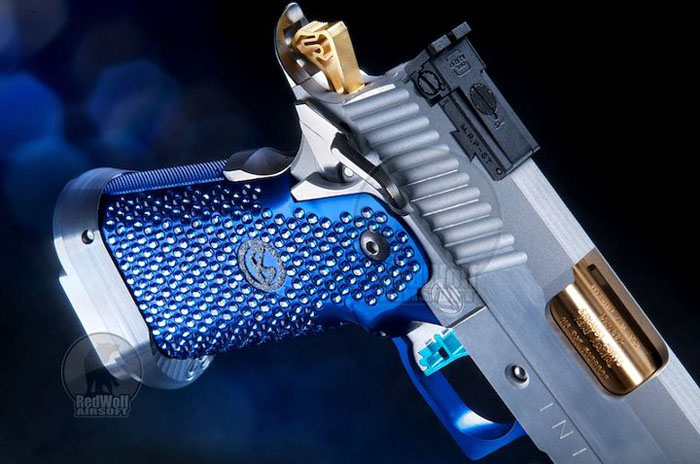 I guess I was right that this will be full blown custom gas blowback airsoft pistol from the Airsoft Surgeon rather than as a kit for you to make your own custom handgun with the bling that'll make Snoopdog want you to be his BFF. With the latest photos on Clarence Lai's latest creation posted at the RedWolf Airsoft Facebook page, we get to see the complete custom work that will either be destined for collector's items, or airsoft players who got a thing or two for bling.