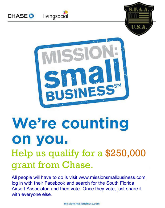 All people will have to do is visit www.missionsmallbusiness.com, log in with their Facebook and search for the South Florida Airsoft Associaton and then vote. Once they vote, just share it with everyone else.