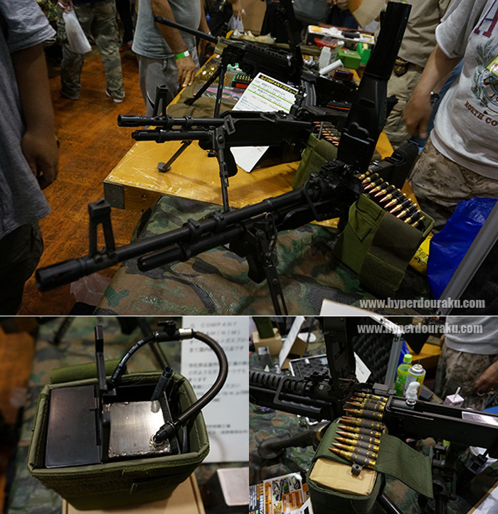 The first thing that he mentioned was about the custom airsoft support weapons from G. Company. On display were Blowback SAWs from the company that are based on the LCT, A&K, and VFC M60 versions. Itsuya, as shown above, was delighted holding one of the custom support weapons, and the intense blowback action sounded attractive for the show visitors.