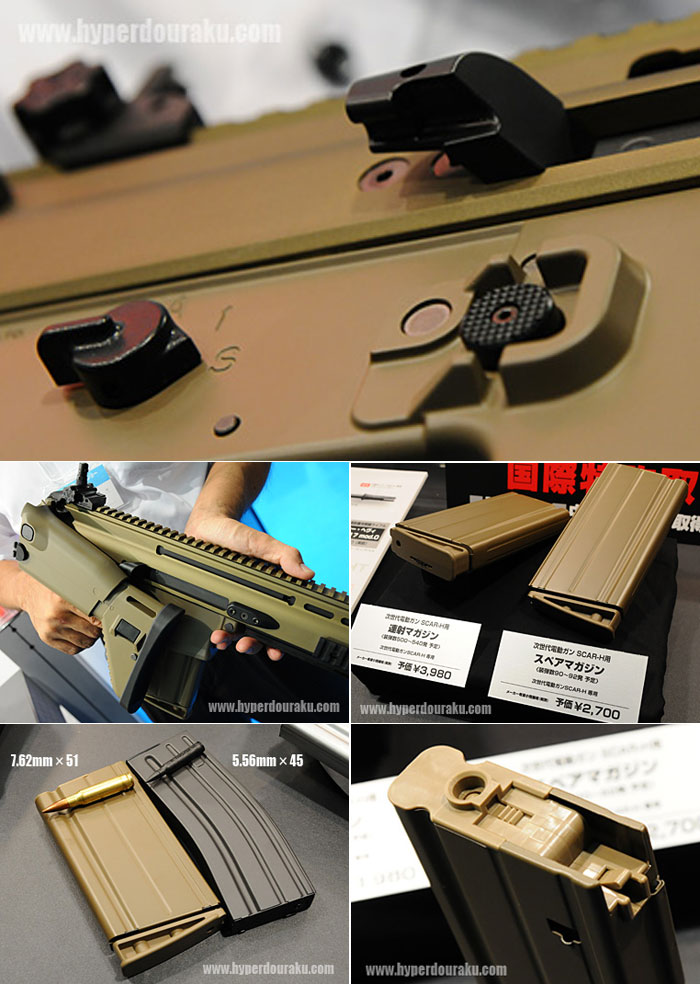 The shell casing deflector at the shell ejection port is also different from the SCAR-L, with the H version having a shorter but wider deflector. The folding stock is 6-stage telescopic whilst the cheek rest is 2-stage. The default SCAR-H magazine that ships with the TM SCAR-H has a capacity of 90-92 rounds and can be bought for JPY2,700 and the higher capacity magazine which can feed 450-500 rounds is sold separately for JPY3,980. Also shown is the the SCAR-H 7.62mm magazine compared to the 5.56mm of the SCAR-L. The standard magazine can be switched to be limited to 20 rounds for those who will play in low-cap games.