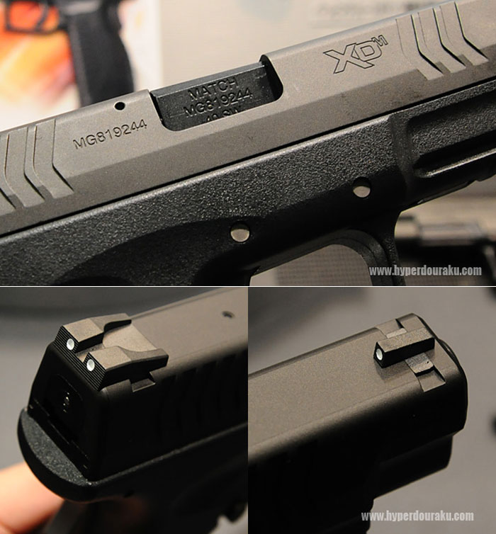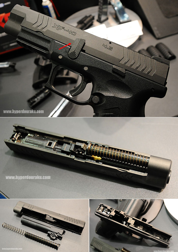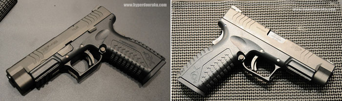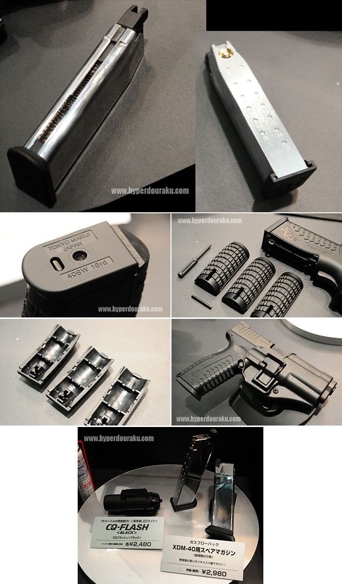 As revealed before, Tokyo Marui finally release the XDM-40 gas blowback pistol. This is a pistol from Springfiled Armory Inc., USA, and has a polymer frame. This model is the calibre .40 SW design with the blowback piston having a large diameter of 15mm and a pretty much strong recoil. The magazine has a capacity of 26 rounds. It is 203mm in length, inner barrel is 99mm, with a pricing of JPY16,800 when it gets released in December 2011. The back of the pistol grip can be replaced and you can choose between small, medium, and large.