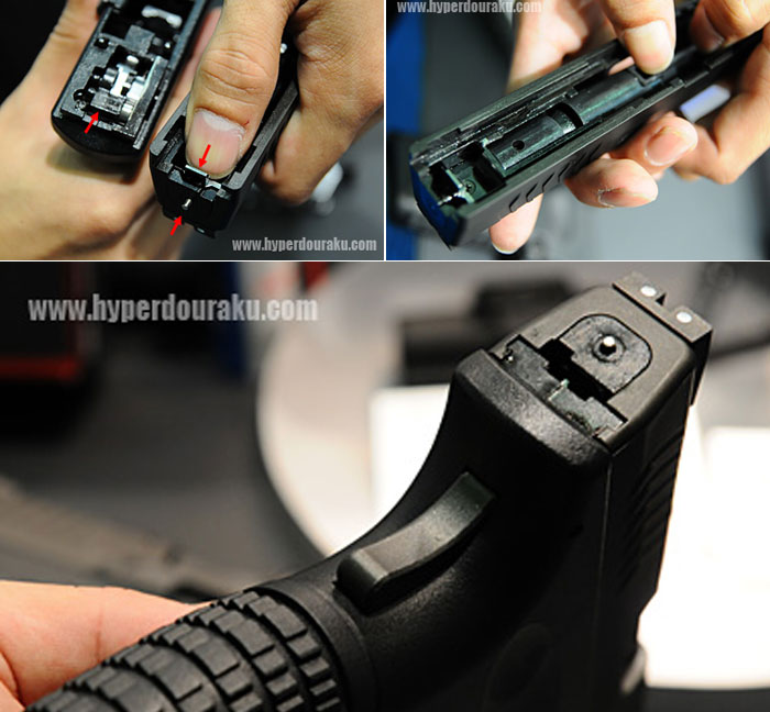 Press the rear slide which hammer will cock the hammer on the internal mechanism to protude a notch. You can remove the 15mm cylinder. The grip also features a safety mechanism which you see in the hi-capa series. It is a no-slip grip. moderately angular with a tension you can't put really describe properly.