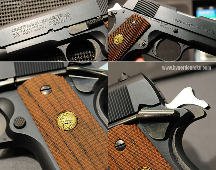 Tokyo Marui has perfectly reproduced the engraved serial number and Colt markings, everything's well polished. The woodgrain grips with the gold colt medallion gives a realistic texture with blast finishing. The grip panel on the inside is filled with weights, and above it is the slide safety stop system. The polished hammer looks like a spur.