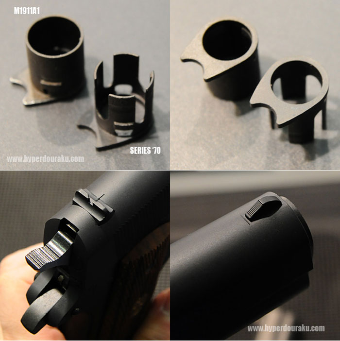 The photos above show the difference between the two Government models, the Series 70 has a redesigned barrel bushing to hold the barrel and give it more accuracy. The outer barrel is also polished nicely and new rear and front sights.