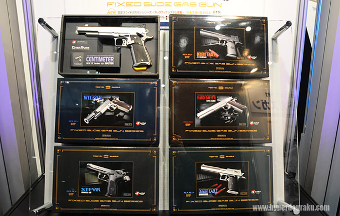Cheaper fixed-slide models on display. With a price of JPY5,980, they will be on sale in early 2012. Yas tried shooting these models at the a shooting area within the Tokyo Marui booth. They are easy to shoot but the trigger pull is heavy.