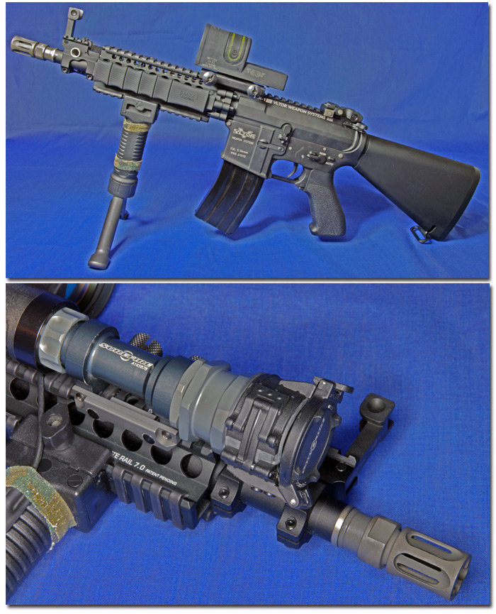 First let me say a couple of things about the donor AEG. Because of its barrel length and furniture I've picked the G&P Sentry. It's a VLTOR M4 with great details, 8mm gearbox and that's exactly what I needed. The gun features a 7-inch quad rail, folding iron sights, VLTOR receiver with markings and a VLTOR collapsible stock what I had to get rid of and changed it to a JG short fixed stock in order to house my huge LiPo battery. The gun is pictured with the modifications I made and not in its stock form. I am planning to use a motorized box magazine later to feed this BB-hungry beast so I used a bipod grip because that will keep the gun from resting on the box mag when I put it down. The Sentry was pictured here with a STAR mid-cap magazine.. This gun won't be a sharpshooter rather than a room sweeper so quick target acquisition is important and the Trijicon RX-30 is perfect for that. Lighting up dark corners and halting enemy advances will be done with the Surefire Millenium M952@120 Lumens (incandescent bulb).