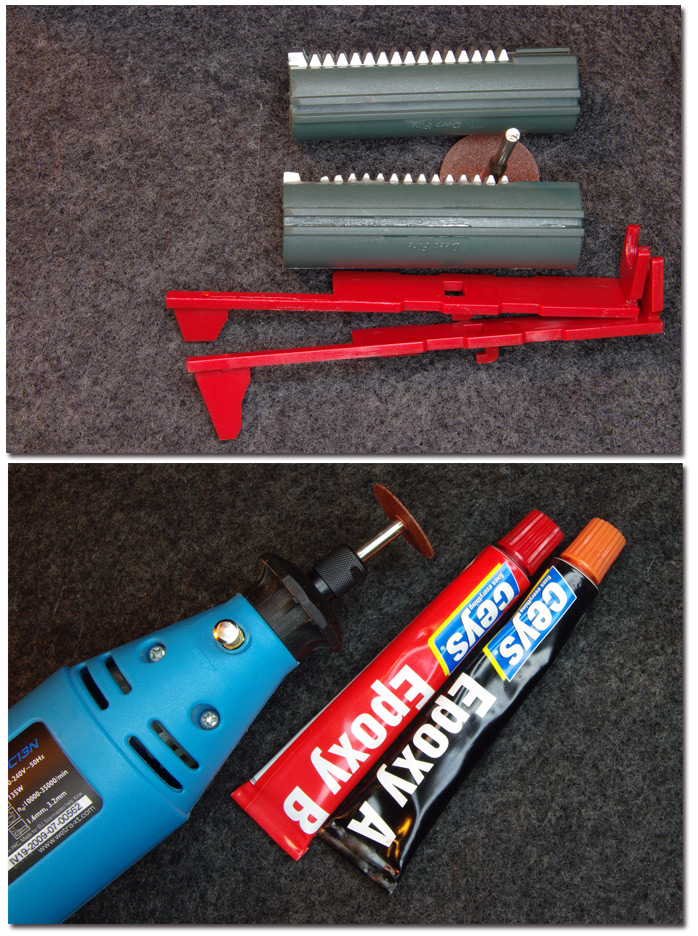 Some players try to do anything to make their rate of fire a little faster. The most common way to achieve higher ROF is to remove a teeth off the sector gear and/or piston and create a short stroking gearbox. Probably this method led to a cool idea which is basically a dual short stroking gearbox. A short stroke sector gear won’t do too much for most of its cycle and this is why Danny included an extra sector on the empty side of the sector gear. It may sound easy (and crazy) but this requires two complete feeding cycles under one revolution and sometimes managing even that one perfect cycle is hard.