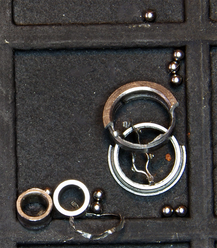 I've shared my experiences with Danny and he told me that in order to reach my goal I am going to need a motor capable to deliver higher performance and I will also need battery pack with higher voltage (at least 14V) and higher discharge rate. Danny took the effort to crunch my numbers and this is what came out: first build with ~26.75Watts; current build ~46.96 and to reach the peak I need around 60 Watts. Of course I also need to improve other things such as shimming, wiring, lubricant, inner barrel, ammo and when I am done with those things then the gearbox might show higher ROF with the currently used M150 spring. My first build was suffering great energy loss probably because of the cylinder assembly I used, but with the current build I think I am on the right track even if I have a long way to go and probably nothing else tells this better than my last picture where you can see how easy to mess up things. This is the leftover of two Modify ball bearings.
