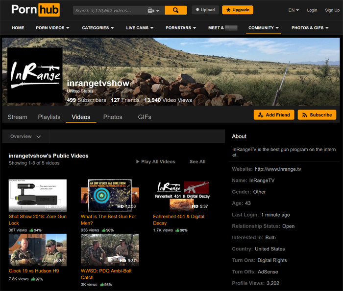 We’re on the third day of reporting about firearms channels on YouTube being under fire especially with the latest policy on content featuring firearms or violations of the Community Guidelines. Spike’s Tactical got suspended due to the latter and now, another firearm channel on YouTube, InRange TV is now posting its videos on PornHub, which is basically the YouTube of porn.