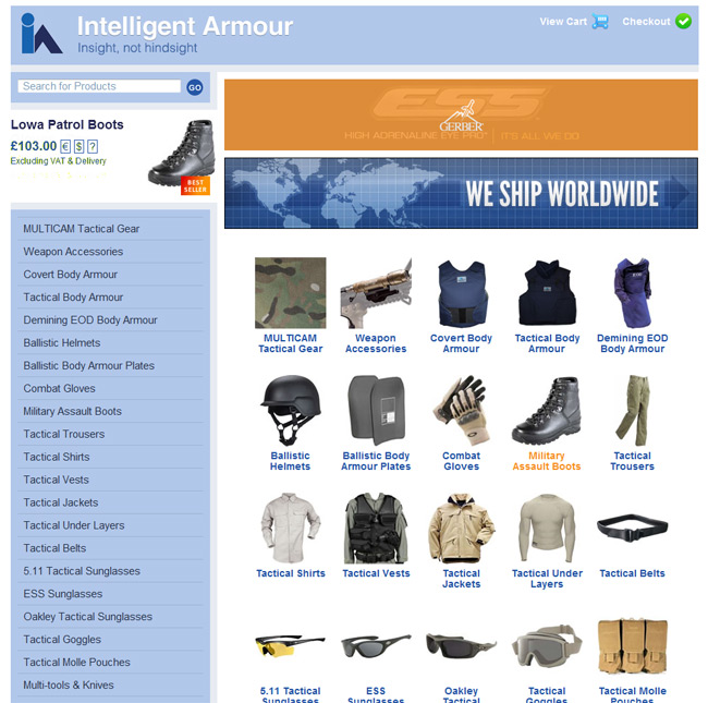 At Intelligent Armour Limited, we see the world as a market place; we ship to over 30 different countries each month. We carry out price checks on a weekly basis to enable us to compete. The military products market as a whole is very out dated in its approach. Intelligent Armour Limited aims for aggressive pricing, clean and clear website style and overall, high quality of service to our clients; with a professional approach, we aim to be one of Europe’s leading on-line stores within the next year.