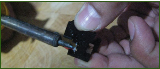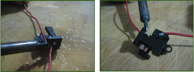 2. Now you have to solder the thinner wire provided, the orange wire goes to the top and the red wire goes at the bottom of the trigger switch mechanism.