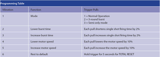 - Automatic 3-round burst to full auto operation after trigger is held for 0.5s Full PWM motor speed control