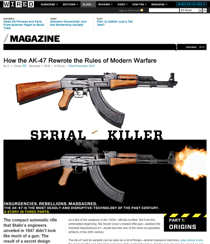 C.J. Chivers has been busy in the book promotion circuit, and he has been active writing about his subject, the AK-47. Excerpts of the book are available for those who haven't gotten a copy yet. In his article in the latest issue of Wired Magazine "How the AK-47 Rewrote the Rules of Modern Warfare" he gives a three-part story on how the most influential rifle in history evolved.