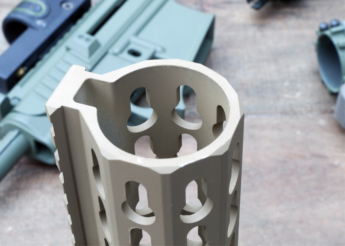 I ordered accessories as well to go on with the handguard: rail sections, flashlight mounts and I even crafted my own handguard panel out of old rail panels based on the open source material, because (hurray!) Keymod is open source. You would think no licensing fees means only good for chinese companies because they can do whatever they want (not that they care anyway). I even thought of coming up with a good design in AutoCAD and give it to my local machinist since the design itself is so easy, but after looking at the rail side of the datasheet a little better, I realized (at least I did) that there is more to it than keyholes cut into some aluminium.