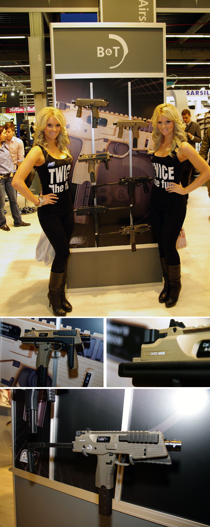 The main attraction (usually where the sales rep will drag you first) was B&T’s TMP or MP9 but I will let you decide which one you would want to call it. Originally developed by Steyr under the name of TMP but a Swiss company Brugger and Thomet added a few extra goodies like folding stock, 20mm rail and trigger safety. The semi auto version is called TP9 and the Germans probably know that better since their versions have to be downgraded to semi only (I won’t move to Germany in the near future that’s for sure). It was built to match the original and there is very little difference between the two and probably you couldn’t point out those differences. I went to see the original one and then back to the ASG booth and let me tell you I was impressed and not because the TWINS were modeling for my photo this time.